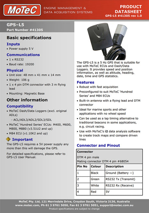 The GPS-L5 is a 5 Hz GPS which combines the electronics and antenna into one small unit. A highly sensitive receiver allows the GPS to lock onto signals even in difficult environments. It is fitted with a DTM connector and is pre-configured to be compatible with MoTeC 'Hundred Series' and M84 ECUs.