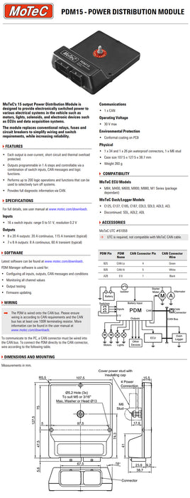 MoTeC’s new 15 output Power Distribution Module (PDM15) is designed to provide electronically switched power to the various electrical systems in the vehicle such as motors, lights and solenoids, and electronic devices such as ECUs and data acquisition systems.